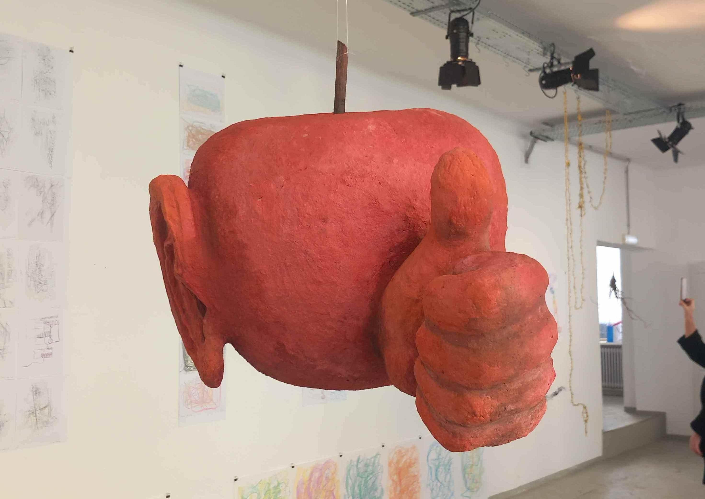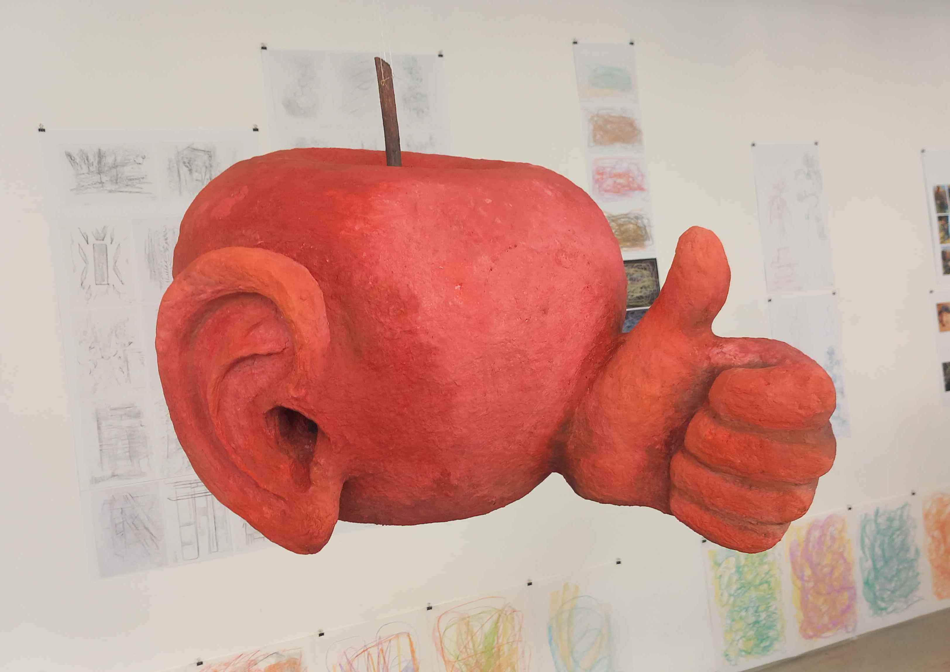 This ominous, hovering object, an apple with an ear and a hand, permanently stuck in a "thumbs up" gesture, exists only to hear and to approve. Although it is inanimate, the human ear and hand imply a consciousness. At exhibitions, the visitors were given the opportunity to write a message on a piece of paper and put it inside the ear of the apple as a way to vent without any feedback other than a "thumbs up".