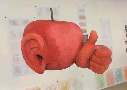 This ominous, hovering object, an apple with an ear and a hand, permanently stuck in a "thumbs up" gesture, exists only to hear and to approve. Although it is inanimate, the human ear and hand imply a consciousness. At exhibitions, the visitors were given the opportunity to write a message on a piece of paper and put it inside the ear of the apple as a way to vent without any feedback other than a "thumbs up".